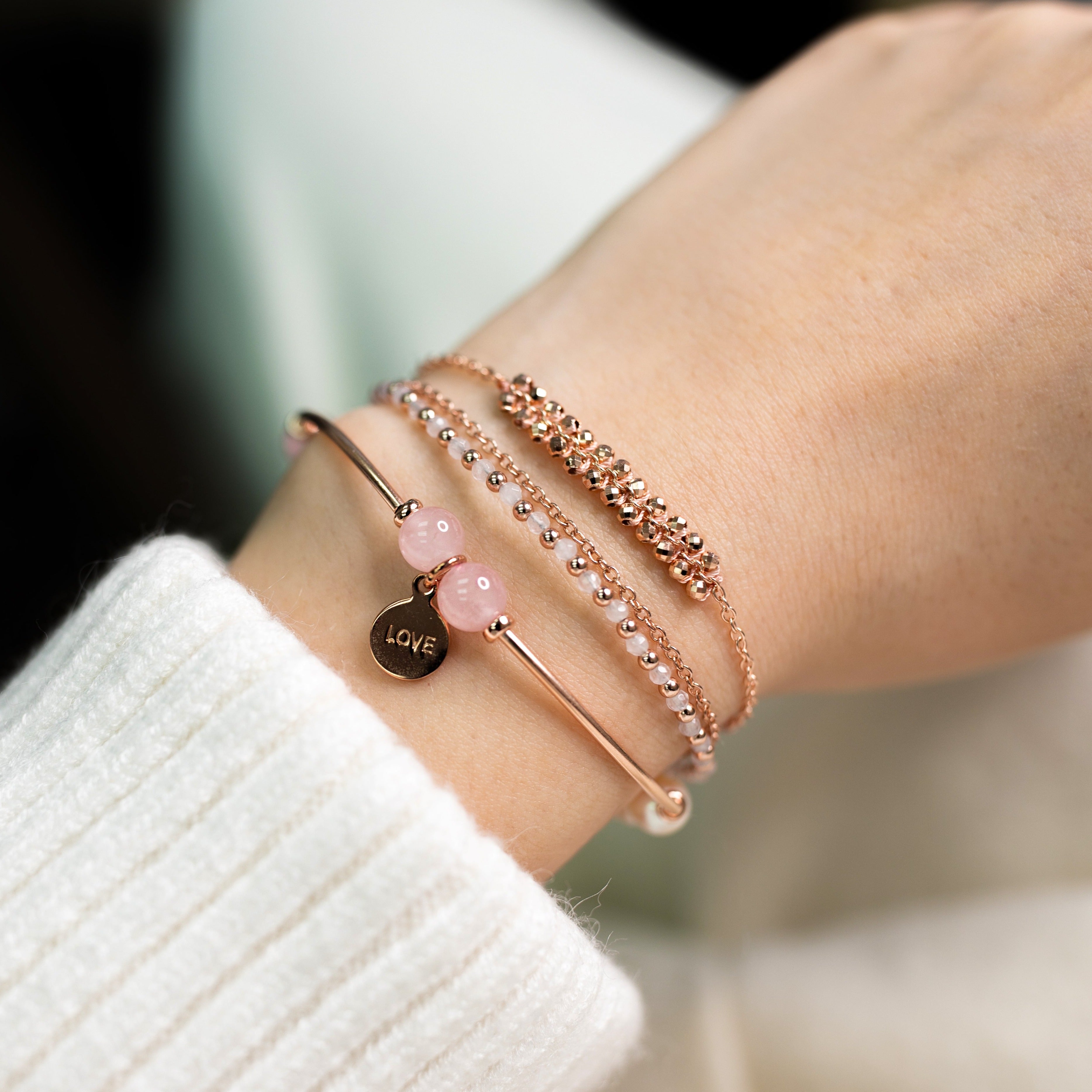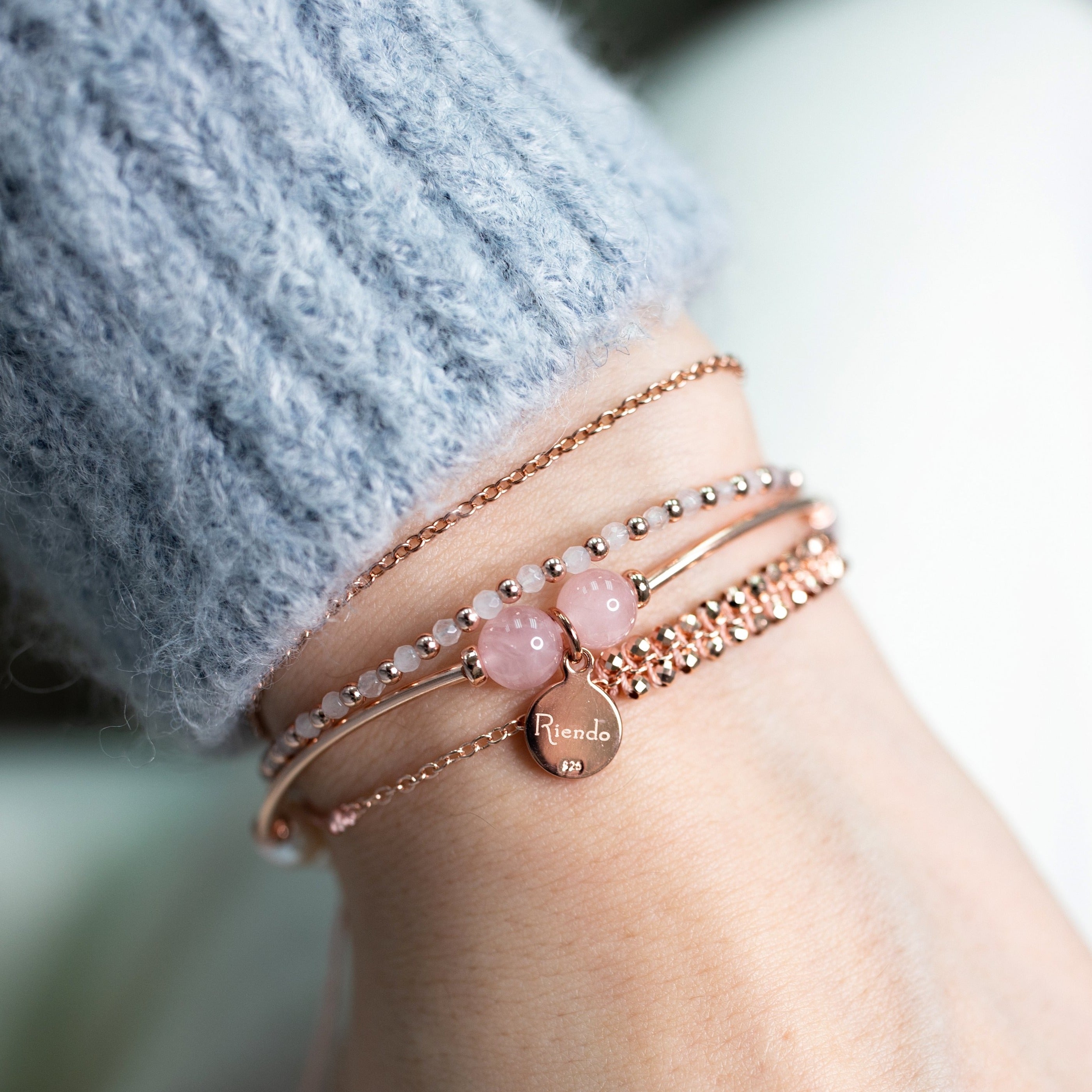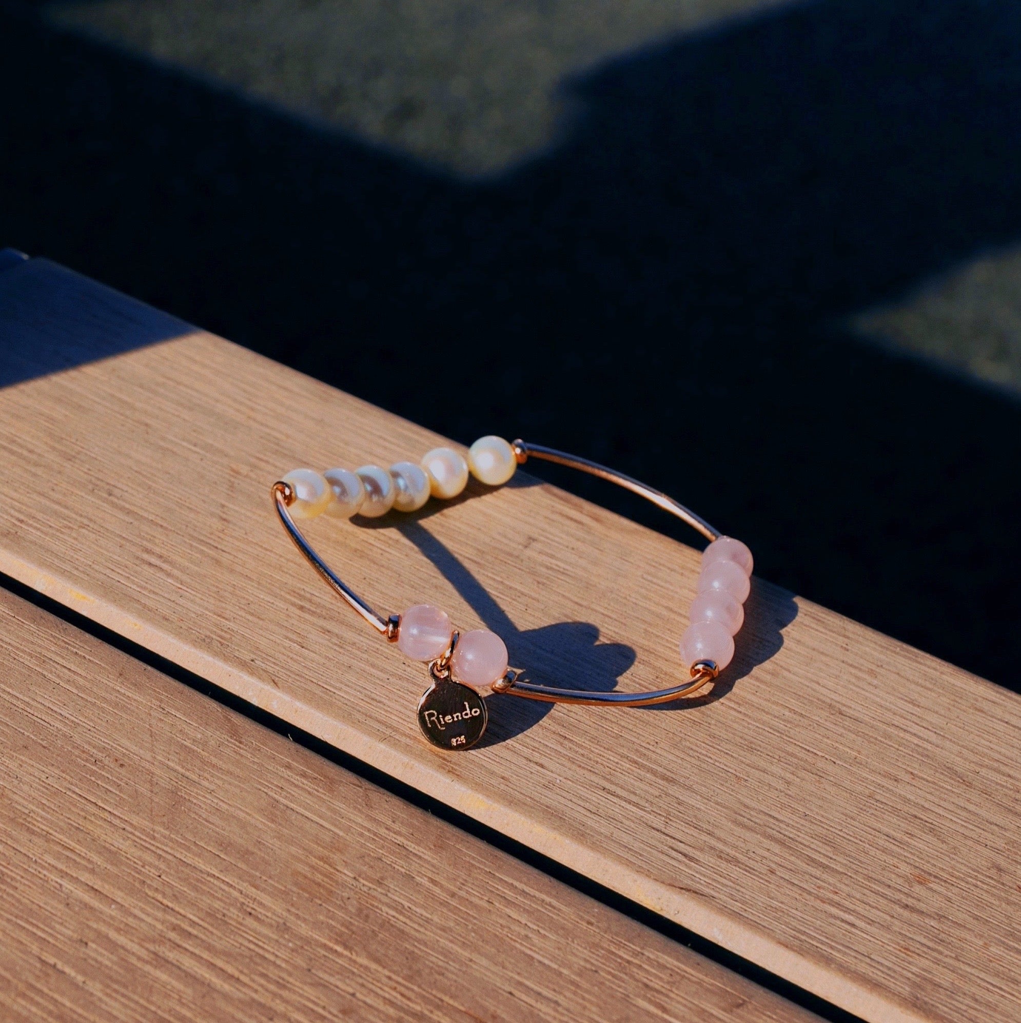 天然晶石和珍珠以純銀電鍍玫瑰金配件串連著